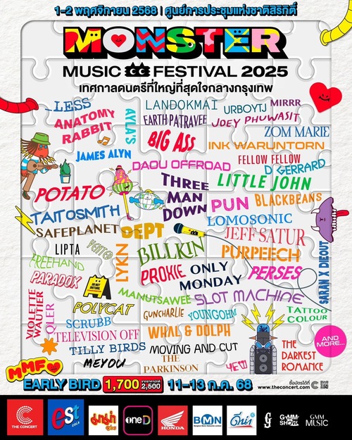 “Monster Music Festival 2025” เปิดจำหน่ายบัตร Early Bird ราคาพิเศษเพียง 1,700 บาท! (จากปกติราคา 2,500 บาท) เปิดขายวันที่ 11-13 กรกฎาคม 2568 ทาง THE CONCERT แอปพลิเคชัน และเว็บไซต์ www.theconcert.com / สำหรับบัตรผ่อน Early Bird (3 งวด): ซื้อผ่านเว็บไซต์ https://ticketier.events/7N2Jl ในราคาเท่ากัน แบ่งจ่ายสบาย ๆ ไม่ต้องรอเงินเดือนออกก็ซื้อได้เลย แล้วเตรียมตัวไปสนุกกัน 2 วันเต็ม เสาร์ที่ 1 และอาทิตย์ที่ 2 พฤศจิกายน 2568 ณ ศูนย์การประชุมแห่งชาติสิริกิติ์ ติดตามรายละเอียด เพิ่มเติม: facebook.com : MonsterMusicFestival / IG: MonsterMusicFest / X : MonsterFest_TH / tiktok :@monstermusicfestival