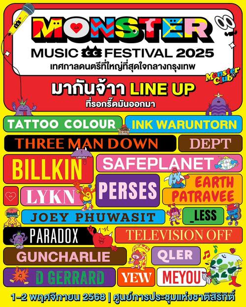 ความสนุกครั้งใหม่กำลังจะกลับมากับ เทศกาลดนตรีที่ใหญ่ที่สุดใจกลางกรุงเทพ “Monster Music Festival 2025” (มอนสเตอร์ มิวสิค เฟสติวัล 2025) พร้อมระเบิดความสนุก แบบนอนสต็อปตลอด 2 วันเต็ม 6 ฮอลล์ ในวันเสาร์ที่ 1 และอาทิตย์ที่ 2 พฤศจิกายน 2568 ณ ศูนย์การประชุมแห่งชาติสิริกิติ์ เตรียมตัวให้พร้อม เพราะงานนี้จัดใหญ่ไฟกระพริบ! โดยทีม GFest ผู้จัดเทศกาลดนตรี Rock Mountain และ Rock On the Beach หน่วยงานภายใต้ GMM SHOW ผู้จัดงานคอนเสิร์ตและเฟสติวัลที่ดีที่สุดของประเทศไทย ขนโปรดักชัน แสง สี เสียง ระดับพรีเมียม มาเอาใจแฟนๆ ในงานนี้