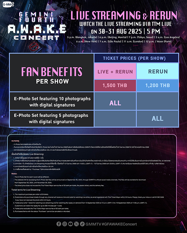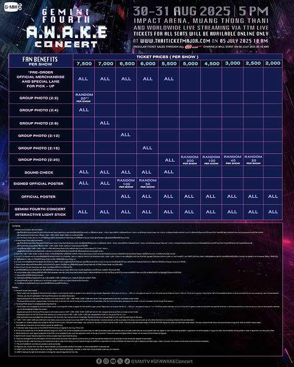 สำหรับผู้ที่สนใจเข้าชม “GEMINI FOURTH A.W.A.K.E CONCERT” สามารถจองบัตรบนช่องทาง Online ในวันเสาร์ที่ 5 กรกฎาคม 2568 เวลา 10.00 น. เป็นต้นไป โดยจะเปิดจำหน่ายบัตรทุกที่นั่ง ทางออนไลน์ www.thaiticketmajor.com เท่านั้น และเปิดจำหน่ายบัตรทุกช่องทางตามปกติ วันอาทิตย์ที่ 6 กรกฎาคม 2568 เวลา 10.00 น. เป็นต้นไป ทาง ไทยทิคเก็ตเมเจอร์ ทุกสาขา หรือ www.thaiticketmajor.com และ Call center โทร 0-2262-3456  บัตรราคา 7,500 / 7,000 / 6,500 / 6,000 / 5,500 / 5,000 / 4,500 / 3,000 / 2,500 และ 2,000 บาท และดูสดผ่าน TTM LIVE บัตรราคา 1,500 / 1,200 บาท (ลิ้งค์และโค้ดรับชม)  (กรณีต้องการรับบัตรพลาสติกที่ระลึก ชำระเพิ่ม 30/ใบ) และติดตามรายละเอียดเพิ่มเติมได้ที่ www.thaiticketmajor.com หรือ www.facebook.com/gmmtvofficial & Instagram & X & TikTok & YouTube & Weibo : GMMTV