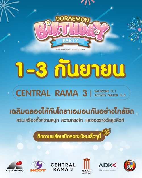 อย่าลืมมาพบกับความสนุกและความอบอุ่นครั้งยิ่งใหญ่ “Doraemon Birthday Party 2025” งานสุดพิเศษเพื่อเฉลิมฉลองวันเกิด “โดราเอมอน” ตัวการ์ตูนขวัญใจของคนไทยและคนทั่วโลก 1-3 กันยายน 2568 นี้