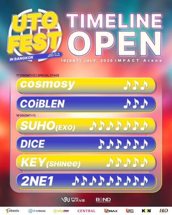 เสริมทัพความสนุก จัดเต็มจาก SUHO (EXO), KEY (SHINee) และ DICE ด้วย นอกจากนี้ยังจะมี Special Stage จากศิลปินรุ่นใหม่ อย่าง วง cosmosy เกิร์ล​กรุปจากประเทศญี่ปุ่น และ COiBLEN ศิลปินสุดพิเศษที่จะมาช่วยกันเติมพลังความมันส์กันให้กับเวที 2025 UTO FEST IN BANGKOK (ยูโต เฟส อิน แบงค็อก)​ วันเสาร์ที่ 19 กรกฎาคม 2568 ณ IMPACT Arena (อิมแพค อารีน่า)​ บัตรราคา (VVIP)​ 6500, (VIP) 5500, (GOLD) 4500, (SILVER) 3500 และ (BRONZE)​ 2000 บาท