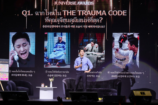 บรรยากาศในฮอลล์เต็มไปความตื่นเต้น และเสียงกรี๊ดจากแฟน ๆ เมื่อจูจีฮุนเปิดตัวกับเสียงร้องสุดละมุนในเพลง ‘You Are In My Arms’ พร้อมรอยยิ้มแสนอบอุ่นราวกับหลุดออกมาจากจอ ก่อนจะพาทุกคนเข้าสู่จักรวาล ‘JUNIVERSE’ พูดคุยแบบเต็มอรรถรสถึงผลงาน และเรื่องราวต่าง ๆ ของเขาอย่างเป็นกันเอง แต่ที่ทำเอาแฟน ๆ กรี๊ดจนแทบเจ็บคอคงหนีไม่พ้นอาการเขินของโอปป้าคนเท่ ที่แอบออกตัวว่าเป็นสเปกของทุกคนเพราะบทบาทในซีรีส์ แต่กลับโดนแฟนคลับตะโกนแซวกลับว่าเพราะความหล่อนี่แหละใช่เลย!! เจ้าตัวถึงกับยิ้มน้อยยิ้มใหญ่แล้วเสิร์ฟเซอร์ไพรส์แรกต่อทันที ด้วยการแจกภาพโพลารอยด์ที่ถ่ายเองบนเวทีพร้อมลีลาเซลฟี่แบบไม่ห่วงหล่อให้กับแฟนคลับผู้โชคดี งานนี้แฟน ๆ ยิ่งหลงความขี้เล่นจนใจละลาย กรี๊ดกันไม่มีหยุด ไม่มีคำว่าเหนื่อย! ความสนุกยังต่อเนื่องแบบยิงยาวกับช่วง JUNIVERSE AWARD ที่เปิดให้แฟน ๆ ร่วมโหวตเรื่องราวเกี่ยวกับจูจีฮุน พาร์ทนี้ทั้งสนุกทั้งเรียกเสียงหัวเราะได้แบบสุด ๆ ต่อด้วยช่วงตอบคำถามที่แฟนคลับในงานเขียนถึงจูจีฮุน บอกเลยว่าแต่ละคำถาม แต่ละคำขอ คอมพลีทกันแบบจัดเต็ม โอปป้าคนดีไม่ทำให้ผิดหวัง ขออะไรก็ให้หมด แจกไม่กั๊กเลยทีเดียว