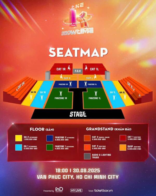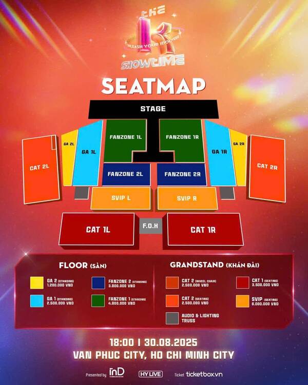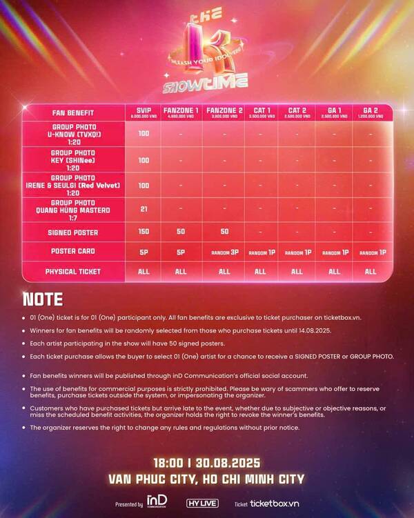 สำหรับงาน THE K-SHOWTIME จะจัดขึ้นในวันเสาร์ที่ 30 สิงหาคม 2025 จำหน่ายในวันเสาร์ที่ 2 สิงหาคม 2025 เวลา 10.00 น. ทาง https://ticketbox.vn/the-k-showtime-24648
