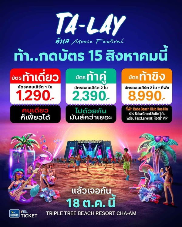 ท้าเล : TA-LAY MUSIC FESTIVAL เปิดขายบัตรในราคาเพียง 1,290 บาท (จากปกติ 2,390 บาท) คุ้มสุดๆ กับบัตรคอนเสิร์ตแพ็คคู่ 2 ใบ ในราคา 2,390 บาท และพิเศษ! ดูคอนเสิร์ตแบบ VIP กับแพ็คเกจบัตรคอนเสิร์ต 2 ใบ พร้อมที่พัก Baba Beach Club หัวหิน ห้อง Baba Grand Suite 1 คืน พร้อม Fast Lane และห้องน้ำ VIP ในราคาเพียง 8,990 บาทเท่านั้น! เตรียมกดบัตรให้ทัน วันที่ 15 สิงหาคม นี้ เวลา 12.00 น. เป็นต้นไปที่ 7/11 ทุกสาขา และ www.allticket.com พร้อมติดตามความสนุกเพิ่มเติมได้ที่ https://www.facebook.com/talaymusicfest