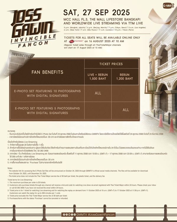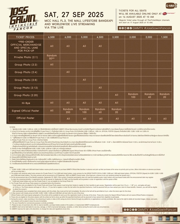 สำหรับผู้ที่สนใจเข้าร่วมงาน “JOSS GAWIN INVINCIBLE FANCON” สามารถจับจองบัตรบนช่องทาง Online ในวันเสาร์ที่ 16 สิงหาคมนี้ เริ่มเวลา 10:00 น. เป็นต้นไป เปิดจำหน่ายทุกที่นั่ง ทางออนไลน์ที่ www.thaiticketmajor.com เท่านั้น และเปิดจำหน่ายบัตร ทุกช่องทางตามปกติ ในวันอาทิตย์ที่ 17 สิงหาคมนี้ เริ่มเวลา 10:00 น. เป็นต้นไป ทางไทยทิคเก็ตเมเจอร์ทุกสาขา, www.thaiticketmajor.com และ Call center โทร 0-2262-3456 บัตรราคา 6,500 / 6,000 / 5,000 / 4,500 / 3,500 / 3,000 /2,000 / 1,500 บาท และดูสดผ่าน TTM LIVE บัตรราคา 1,500 / 1,200 บาท (ลิ้งค์และโค้ดรับชม) กรณีต้องการบัตรพลาสติกที่ระลึกชำระเพิ่ม 30 บาทต่อใบ ติดตามรายละเอียดเพิ่มเติมได้ที่เว็บไซต์ : www.thaiticketmajor.com Facebook : www.facebook.com/gmmtvofficial และ Instagram & X & TikTok & YouTube & Weibo : GMMTV