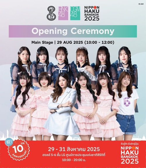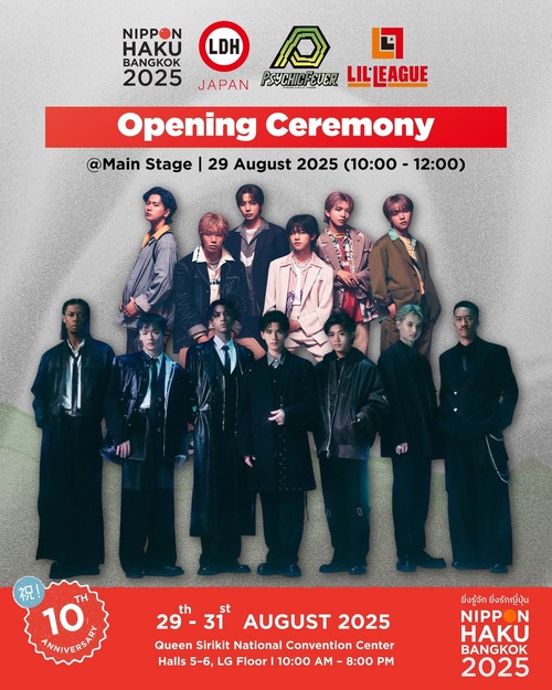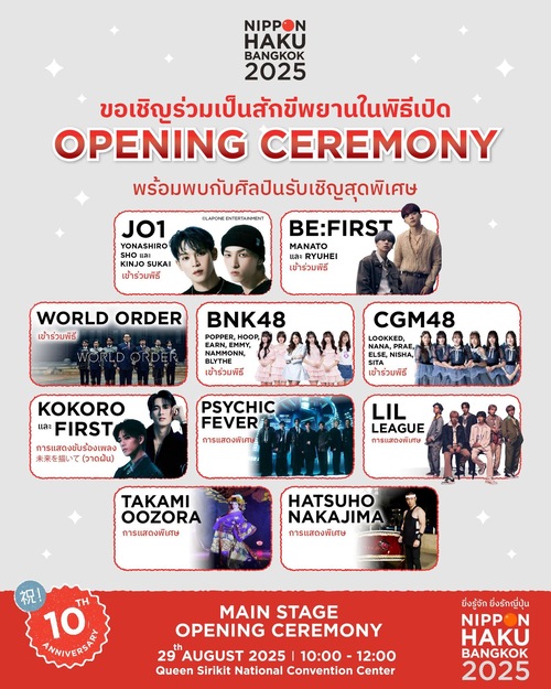 กลับมาสร้างความบันเทิงเติมเต็มความสุขให้เจแปนเลิฟเวอร์กันอีกครั้ง กับงานมหกรรมของคนรักญี่ปุ่นแบบครบทุกมิติ “นิปปอนฮาคุ แบงคอก 2025” (NIPPON HAKU BANGKOK 2025) ฉลองครบรอบ 10 ปีของการจัดงาน กับคอนเซ็ปต์ “ยิ่งรู้จัก ยิ่งรักญี่ปุ่น” ที่นอกจากรวบรวมทุกเรื่องราวของความเป็นญี่ปุ่นบินลัดฟ้ามาเสิร์ฟให้คนไทยได้ใจฟูกันในงานแล้ว ในส่วนของกิจกรรมความบินเทิงก็จัดเต็มไม่แพ้กัน เพราะเตรียมขนทัพศิลปิน ไทย – ญี่ปุ่น ขึ้นระเบิดความมันส์ตลอดทั้ง 3 วัน เอาใจคนรักญี่ปุ่นสายบันเทิง เตรียมมาแดนซ์ มามันส์ กันให้สะเทือนไปทั้งฮอลล์ได้เลย