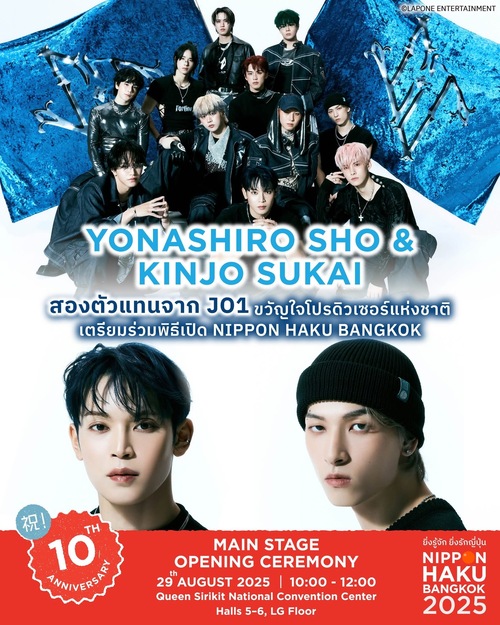 - 2 หนุ่มสุดฮอต ตัวแทนจาก JO1 – YONASHIRO SHO และ KINJO SUKAI ที่ เตรียมบินตรงจากญี่ปุ่น เพื่อมาร่วมพิธีเปิดงาน NIPPON HAKU BANGKOK