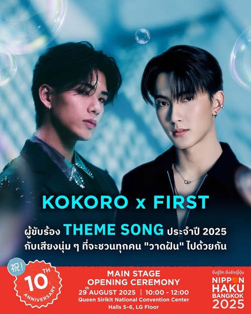 โดยปีนี้นำทัพศิลปินโดย “KOKORO” หนึ่งในศิลปินสมาชิกวงสุดฮ็อต PSYCHIC FEVER from EXILE TRIBE จากค่ายยักษ์ใหญ่ LDH ที่กำลังมาแรงและโด่งดังในวงการเจป็อปไทยอย่างฉุดไม่อยู่ กับศิลปินเจ้าบ้าน “เฟริสท์ – ฉลองรัฐ “ ศิลปินหนุ่มสุดฮอต ที่เสียงละมุนอบอุ่นหัวใจ ที่ปีนี้ได้เป็นตัวแทนขับร้องเพลงธีม “未来を描いて (วาดฝัน)” เพลงที่เกิดจากหัวใจของศิลปินสองคน ต่างที่มา ต่างภาษา แต่มีความฝันเดียวกัน เพื่อถ่ายทอดพลัง ความหวัง และแรงบันดาลใจ ผ่านเสียงร้องและเคมีที่ลงตัวของทั้งสองศิลปิน และยังเป็นสัญลักษณ์ของมิตรภาพระหว่างไทย-ญี่ปุ่น ที่เติบโตและงดงามขึ้นทุกปี