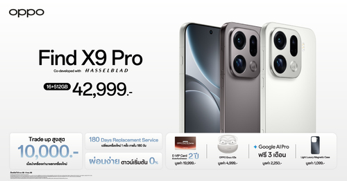 - พิเศษสำหรับผู้ที่สนใจ OPPO Find X9 Series เป็นเจ้าของได้ง่ายยิ่งขึ้นด้วย UFUND ดาวน์เริ่มต้น 0 บาท ผ่อนสบายสูงสุด 48 เดือน ไม่ต้องใช้บัตรเครดิต