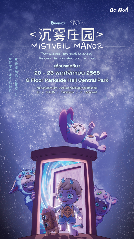 สาวกอาร์ตทอยได้กรี๊ดสนั่น! เมื่อ Boonaz (บูนาซ) แบรนด์คาแรกเตอร์ชื่อดัง มากุมหัวใจชาวไทยด้วยคาแรกเตอร์มอนสเตอร์ตัวน้อยแสนลึกลับ เปิดคอลเลกชันใหม่ “Mistveil Manor Plush Series” ที่ได้ศิลปินระดับโลกและไอคอนอย่าง “แบมแบม กันต์พิมุกต์ ภูวกุล” (BamBam GOT7) มาร่วมถ่ายทอดแนวคิด “The Courage to Express Yourself” (ความกล้าที่จะเป็นตัวเอง) พร้อมเปิดประสบการณ์สุดพิเศษครั้งแรกในประเทศไทย กับ Limited Pop-Up Store ใจกลางกรุงเทพฯ จัดเต็มทั้งกิจกรรมสุดสนุกและสินค้าสุดเอ็กซ์คลูซีฟ ณ พาร์คไซด์ ฮอลล์ ชั้น G, เซ็นทรัล พาร์ค ระหว่างวันที่ 20 – 23 พฤศจิกายน 2568 นี้เท่านั้น