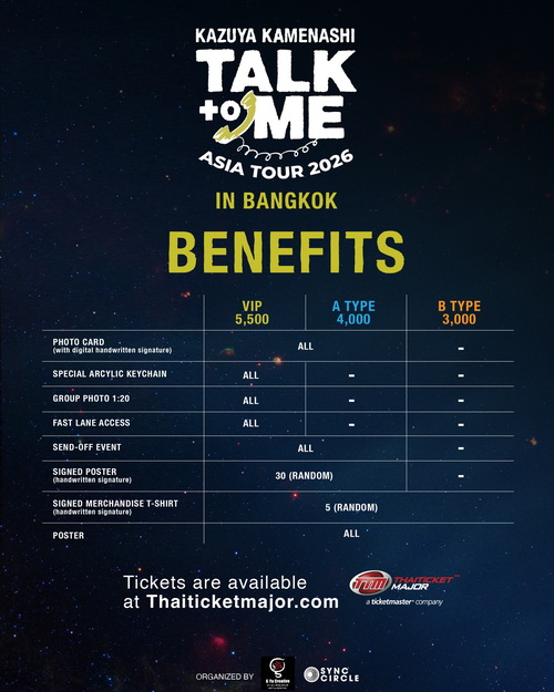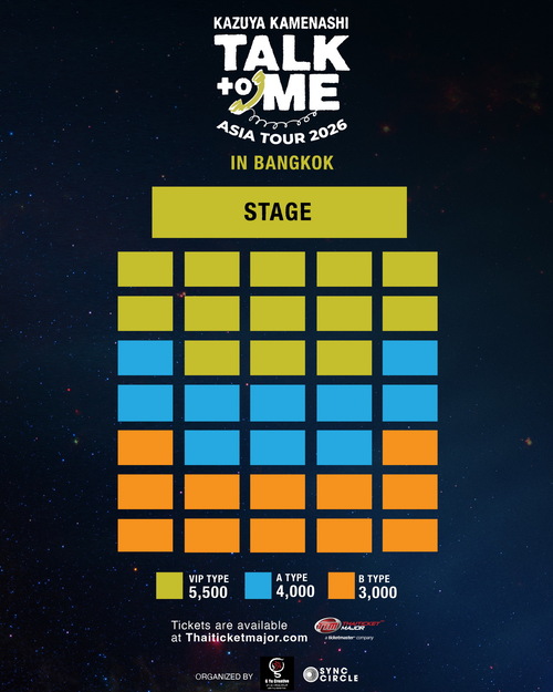 “Kazuya Kamenashi “TALK to ME” Fan Meeting Asia Tour 2026 in Bangkok” วันเสาร์ที่ 7 กุมภาพันธ์ 2569 Central Pulse, centralwOrld ชั้น 7 บัตรราคา 5,500 / 4,000 / 3,000 บาท