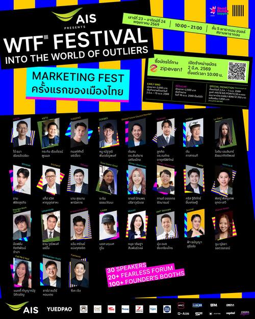 “AIS PRESENTS WTF Festival 2026 : into the world of outliers” เปิดลงทะเบียนจองบัตรเข้างานแล้วที่ ZipEvent https://www.zipeventapp.com/e/WTF-FestivalInto-the-World-of-Outliers บัตรร่วมงาน มีทั้งการเข้าชมฟรี โซน Founder’s Fair และ Fearless Forum และ การจำหน่ายบัตรโซน Outliers Talk บัตร Early Bird ราคา 2,000 บาท (2 มี.ค. – 15 เม.ย. 2569) และ บัตร Regular ราคา 2,500 บาท (ตั้งแต่ 16 เม.ย. 2569 เป็นต้นไป) สิทธิพิเศษสำหรับลูกค้า AIS ใช้ AIS POINTS 50 คะแนน ลดราคาบัตร Early Bird ได้ 350 บาท เหลือเพียง 1650 บาท เริ่มแลกสิทธิ์ 2 มีนาคม 2569 เวลา 10.00 น. – 1 เมษายน 2569 เวลา 23.59 น. จำกัด 500 สิทธิ์แรกเท่านั้น รับสิทธิ์ได้ที่ myAIS หรือ คลิก https://m.ais.co.th/oZHPPEZf4