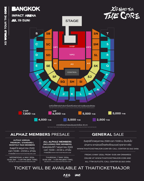 สำหรับเหล่าหมาป่าที่เตรียมร่วมสัมผัสประสบการณ์ระดับโลก เตรียมตัวให้พร้อม! บัตรเข้าชมงาน XG WORLD TOUR: THE CORE IN BANGKOK ราคาเริ่มต้นที่ 2,500 บาท โดยแฟนคลับตัวจริงสามารถคว้าสิทธิ์จับจองที่นั่งก่อนใครในรอบ ALPHAZ ANNUAL PREMIUM/STANDARD・MONTHLY PAID MEMBERS PRESALE ในวันพุธที่ 6 พฤษภาคม 2569 เวลา 10.00 – 23.59 น. และเปิดขายบัตรรอบ ALL ALPHAZ MEMBERS (INCLUDING FREE MEMBERS) PRESALE ในวันพฤหัสบดีที่ 7 พฤษภาคม 2569 เวลา 10.00 – 23.59 น. ผ่านทาง www.thaiticketmajor.com (ดูรายละเอียดเพิ่มเติมเกี่ยวกับรอบ ALPHAZ Pre-Sale ได้ที่ http://xgalx.com/) สำหรับรอบจำหน่ายบัตรทั่วไป จะเริ่มเปิดขายในวันศุกร์ที่ 8 พฤษภาคม 2569 เวลา 10.00 น. เป็นต้นไป ผ่านทาง www.thaiticketmajor.com หรือ เคาน์เตอร์ไทยทิกเก็ตเมเจอร์ทุกสาขา Call Center 02-262-3456