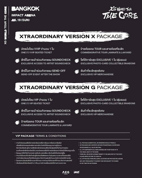| รายละเอียด สิทธิประโยชน์ สำหรับบัตร VIP | Xtraordinary Version X PACKAGE บัตรนั่งโซน VVIP จำนวน 1 ใบ สิทธิ์ในการเข้าร่วมกิจกรรม Soundcheck สิทธิ์ในการเข้าร่วมกิจกรรม Send-off ป้ายห้อยคอ Tour และสายห้อยที่ระลึก โฟโต้การ์ดสุด Exclusive 1 ใบ (สุ่มแบบ) สินค้าที่ระลึกสุดพิเศษ Xtraordinary Version G PACKAGE บัตรนั่งโซน VIP จำนวน 1 ใบ สิทธิ์ในการเข้าร่วมกิจกรรม Soundcheck ป้ายห้อยคอ Tour และสายห้อยที่ระลึก โฟโต้การ์ดสุด Exclusive 1 ใบ (สุ่มแบบ) สินค้าที่ระลึกสุดพิเศษ |